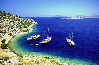 Bahías de Gocek : navegue por las hermosas bahías y calas de Gocek y disfrute de la naturaleza en todo su esplendor. Pase la noche en Agalimani, una de las bahías más hermosas de la costa mediterránea turca, o en Hamam, donde podrá ver una antigua iglesia hundida y las ruinas de los baños hundidos de Cleopatra.